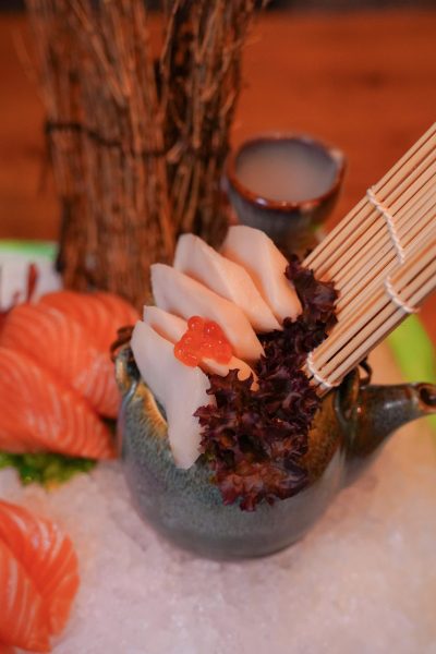 Nigiri: 1 Stk. Ebi, 1 Stk. Sake Maki: 6 Stk. Sake I-O: 8 Stk. California/ Kataif