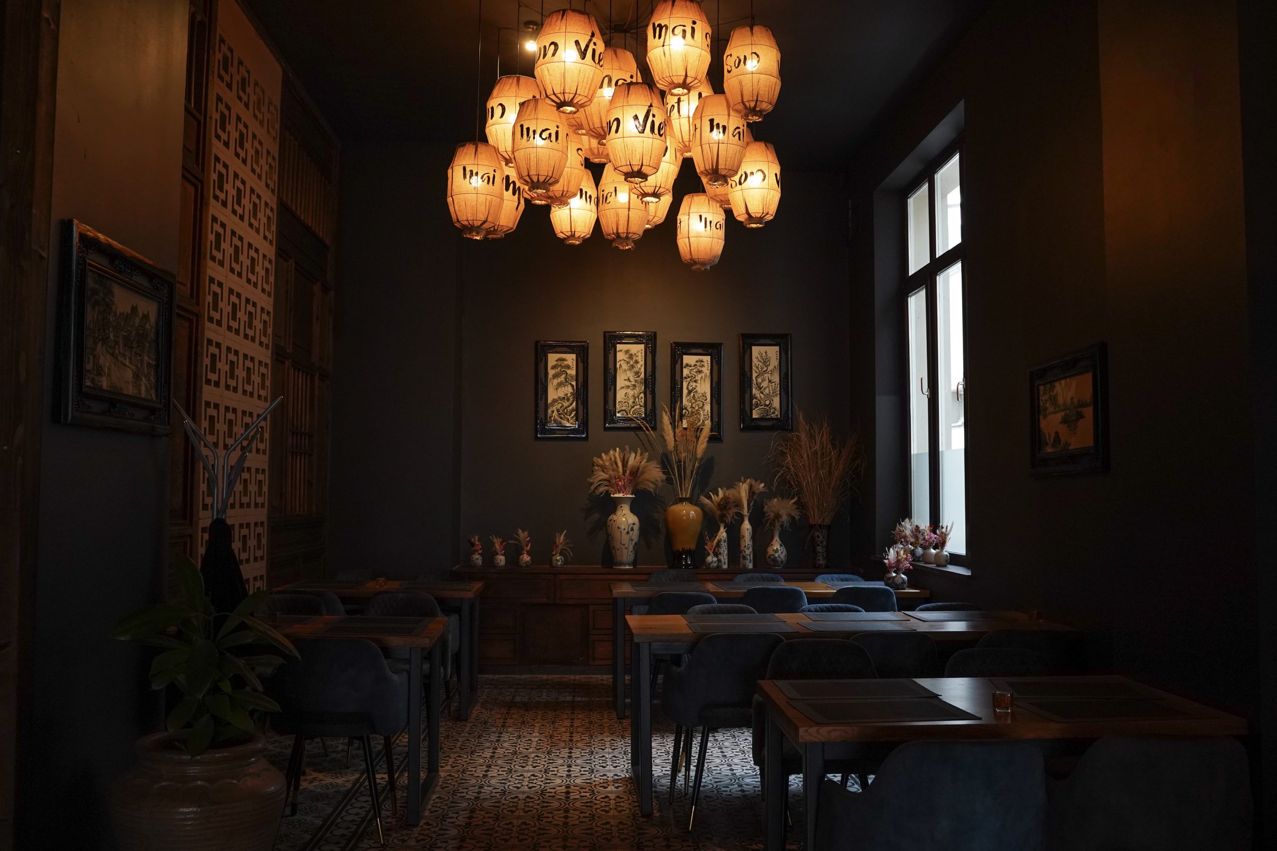 Verschieden Deko-Elemente aus Holz und warmen Licht wurde eingesetzt, um ein altes Haus in einem vietnamesischen Dorf darzustellen, welches ein Gefühl von heimischen Gerichten wiedergeben soll und somit zu einem wohligen Dinner einladen.